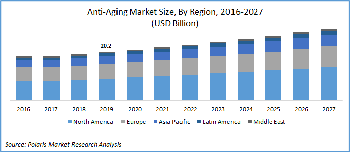 全球抗衰老市场于2019年估价为202亿美元,预计预测期内的复合年增长率为5.1%。市场的增长归功于意识和意识的增加,特别是在中年的内部身体外观,以及新的抗衰老治疗程序中的创新。此外,可支配收入增加和生长工作人口,加上化妆品中心的上升。